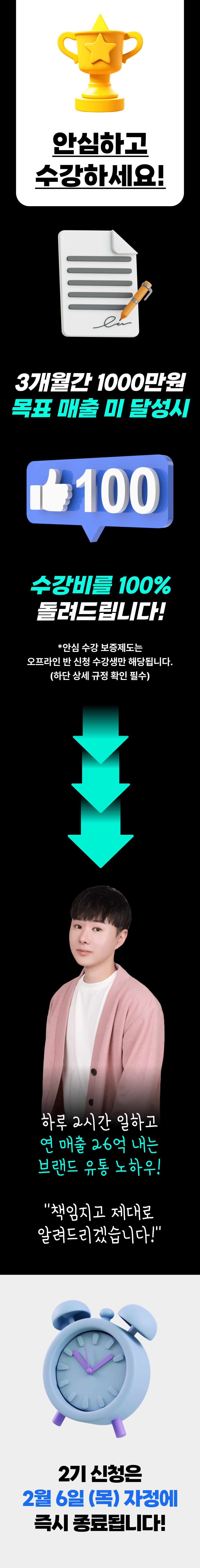 수강 종료 후 3개월 내 1000만원 매출이 나오지 않았을 경우 수강비를 100% 돌려 드립니다.