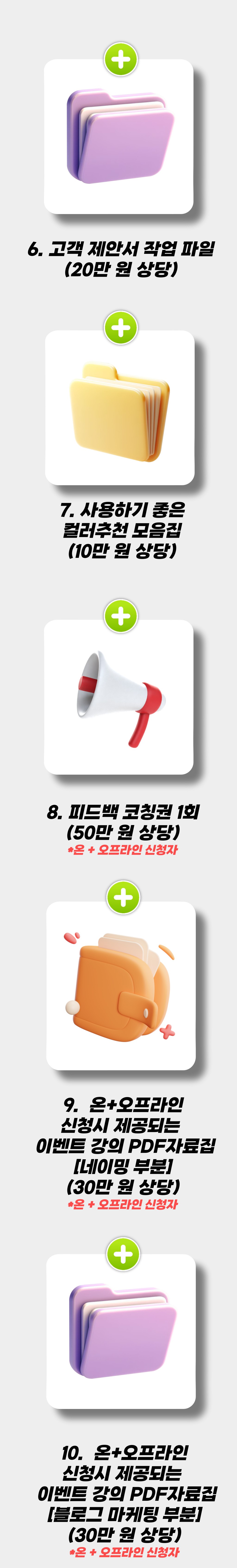 1. 최적화 양식서 (10만 원) 2. 로고 유형별 분석 체크리스트 (10만 원) 3. 실전에 사용하기 좋은 목업 모음 (고급) (20만 원) 4. 실전에 사용하기 좋은 배경 모음 (20만 원) 5. 대, 소봉투 디자인 및 인쇄파일 가이드 (10만 원) 6. 고객 제안서 작업 파일 (20만 원) 7. 사용하기 좋은 컬러 추천 모음집 (10만 원)