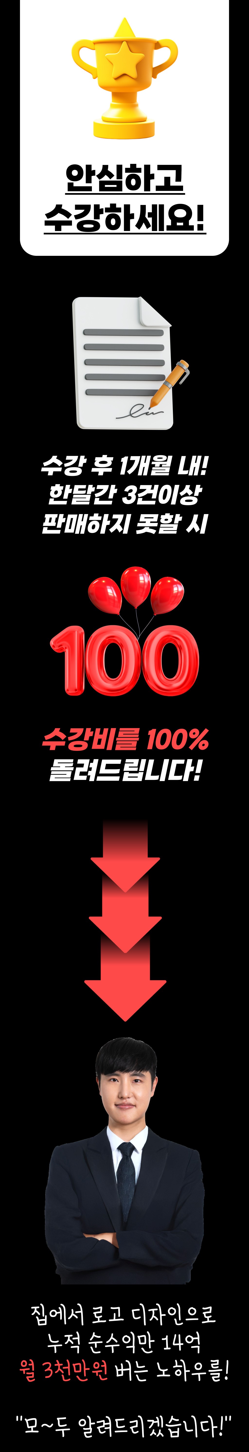 정규과정 수료 이후 한 달간 3건이상 판매 못할시, 수강료 100% 환불이 가능합니다. 수강기간 내 정규 강의 100% 참석 및 완강 필수. (기본 / 지각, 결석은 100% 참석으로 인정되지 않습니다.) 주차별 과제를 기한 내 100% 정상 제출한 수강자에 한해 적용 (기본) 판매 시작일 로부터 크몽 플러스 광고를 최소 4주 진행해야 합니다. (광고 비용 있음) 문의 및 의뢰가 들어왔으나 시간 부족 등 개인의 문제로 판매하지 못한 건은 인정되지 않습니다.