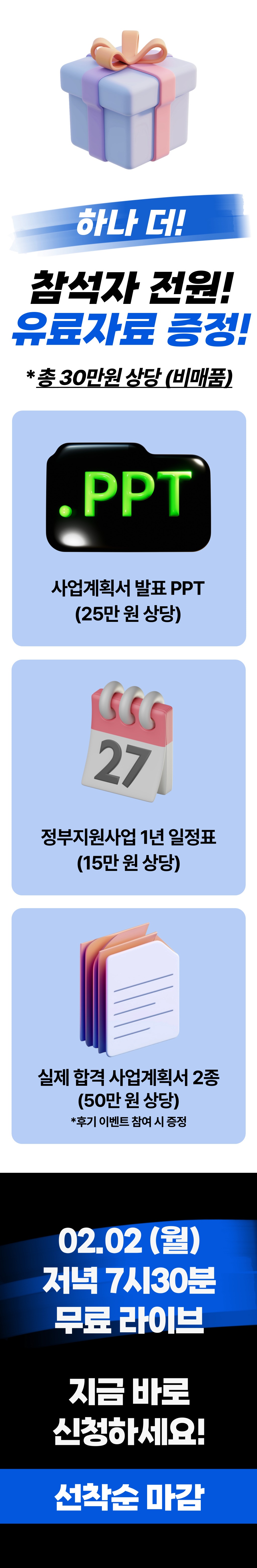 사업 계획서 하나로 정부지원금 1억 받는 노하우!(y)무료 누적 신청자 수 : 54 명 사업 계획서 하나로 정부지원금 1억 받는 노하우!(y) 수량 바로신청 카테고리: 무료강의 2026-02-02 19:30:00 바로신청
