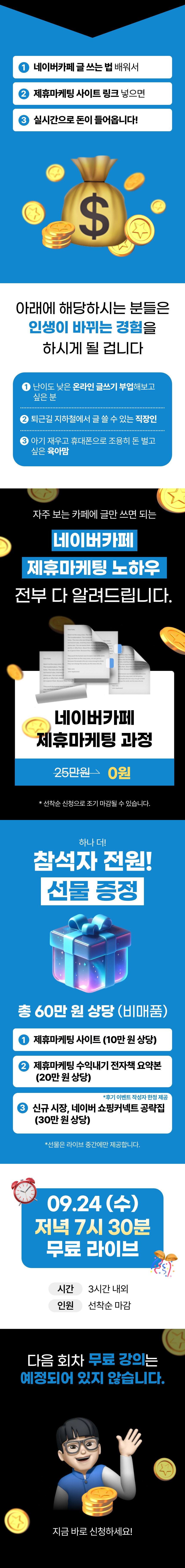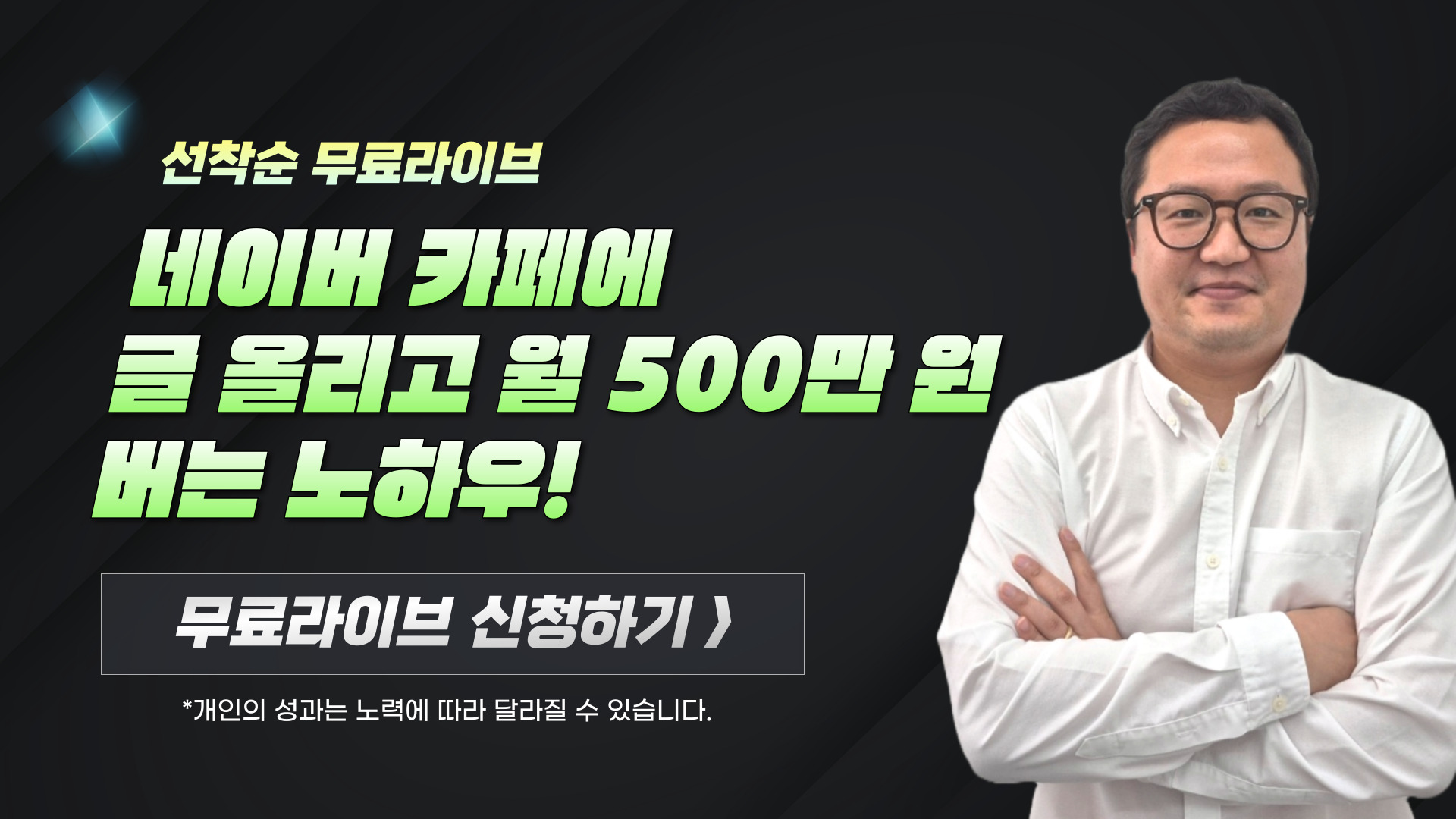 네이버 카페에 글 올리고 월 500만 원 버는 노하우!(f)무료 누적 신청자 수 : 570 명 네이버 카페에 글 올리고 월 500만 원 버는 노하우!(f) 수량 바로신청 카테고리: 무료강의 2025-09-24 19:30:00 바로신청