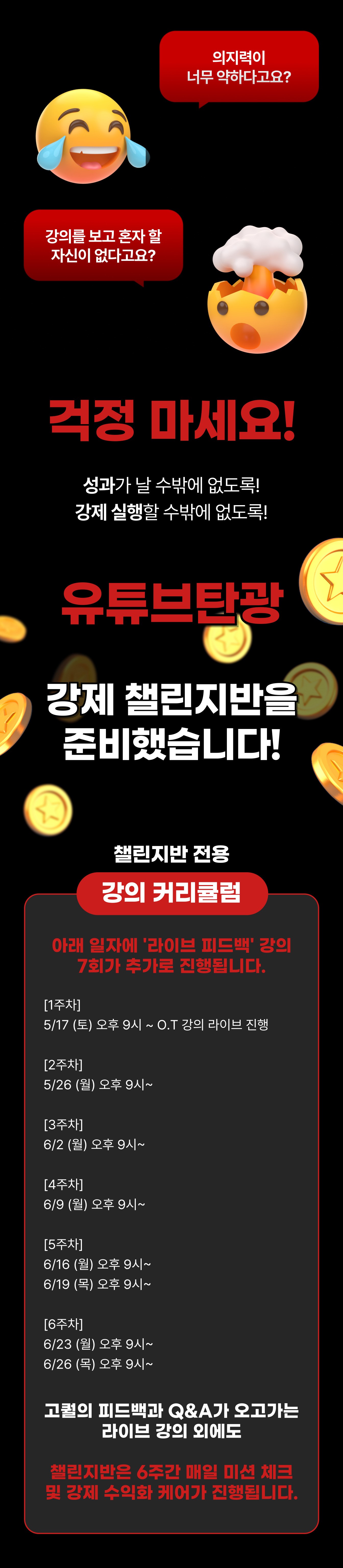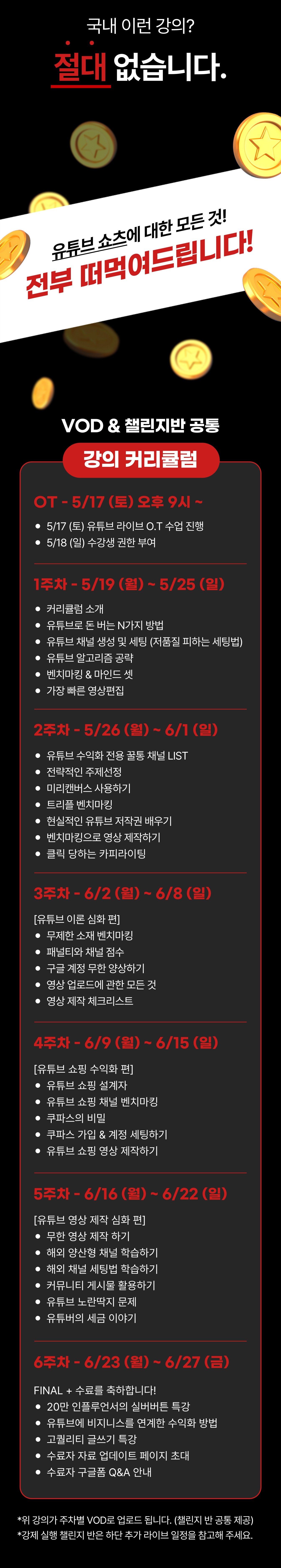 VOD + 강제 챌린지 반 : 본 강의는 VOD + 라이브 강의 7회 + 데일리 미션 챌린지 형태로 총 6주간 진행되는 강의입니다.
