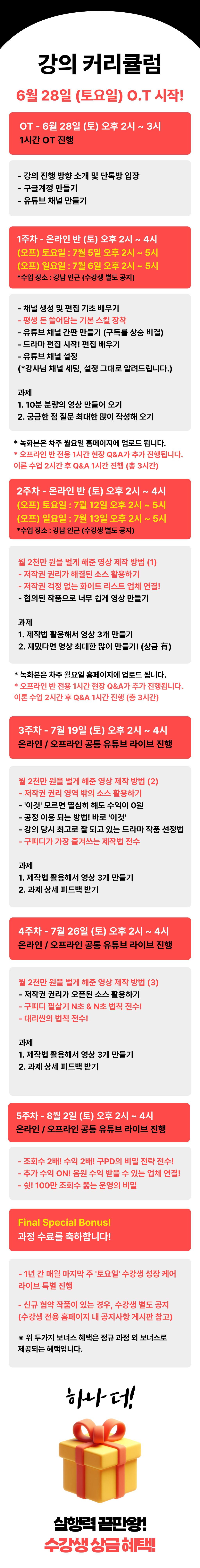 수강 상세 규정 1. 강의 형태 및 수강 기간 : (온라인 + 오프라인반 해당) 본 강의는 온라인 라이브 + 오프라인 현장 강의 과정으로 O.T 주차를 포함하여 총 6주간 진행됩니다. 강의 시작 일자 및 상세 커리큘럼은 상단 이미지 내 확인이 가능합니다.