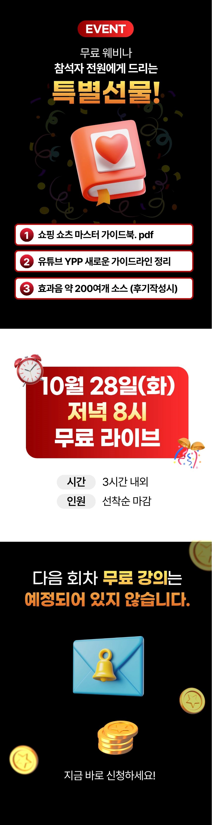 구독자 0명으로도 돈 버는 유튜브 쇼핑!무료 누적 신청자 수 : 415 명 구독자 0명으로도 돈 버는 유튜브 쇼핑! 수량 바로신청 카테고리: 무료강의 2025-10-28 20:00:00 바로신청