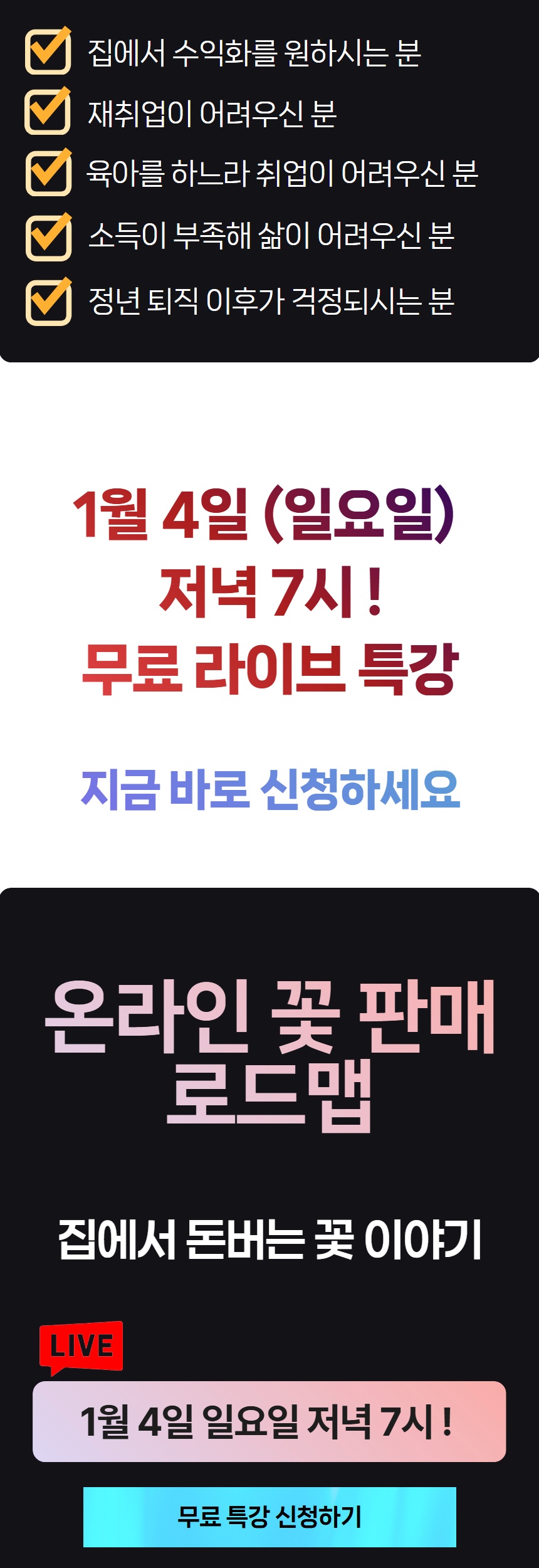 특별한 경력 없이, 육아하며 시작한 온라인 꽃집으로 연 매출 23억 낸 노하우!무료 누적 신청자 수 : 562 명 특별한 경력 없이, 육아하며 시작한 온라인 꽃집으로 연 매출 23억 낸 노하우! 수량 바로신청 카테고리: 무료강의 2026-01-04 19:00:00 바로신청