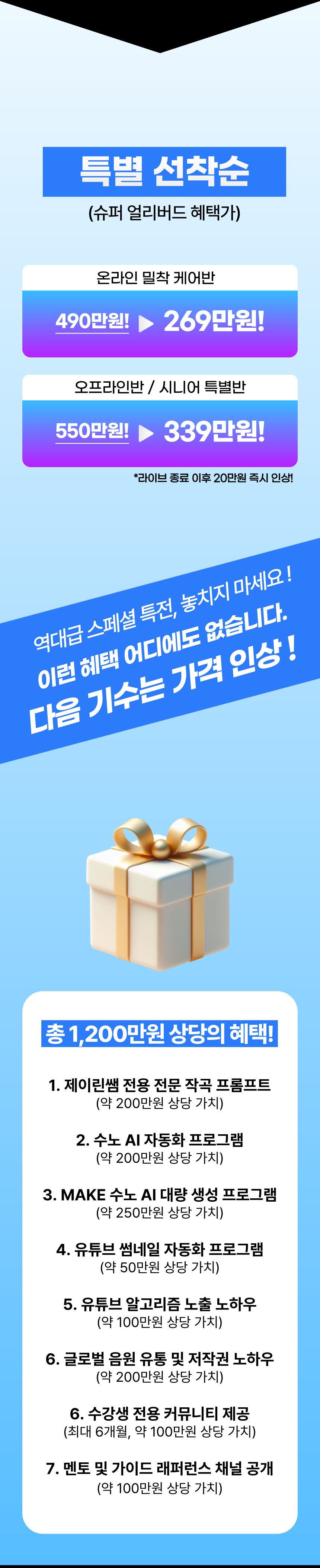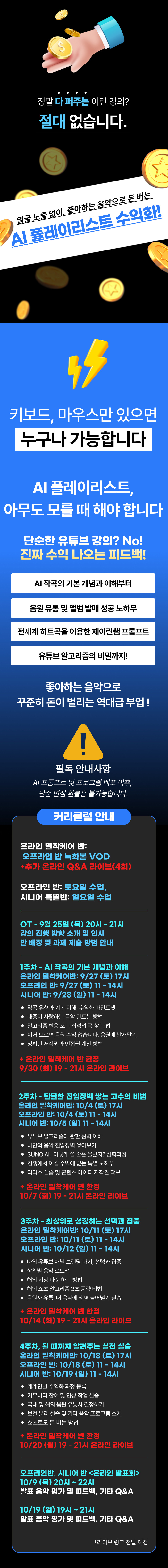 - 본 정규 과정에는 일정 금액 이상의 AI 월 구독료가 발생할 수 있습니다. (Suno AI, 챗GPT, 미드저니 등)