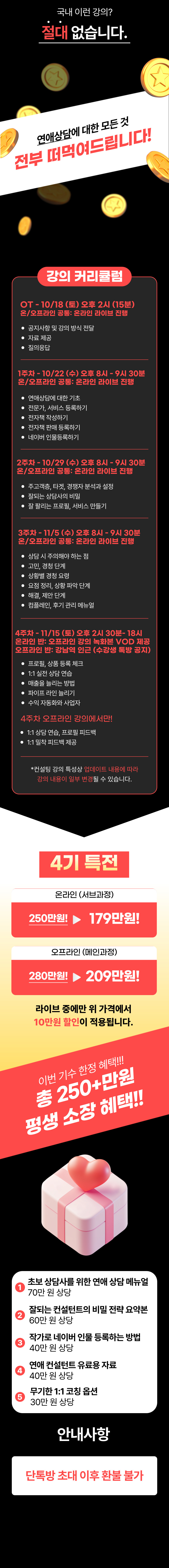 오프라인 및 온라인 수업 참석은 본인에 한해 가능하며 동행 및 타인 공유 시 그 즉시 수강 종료 처리되며 환불 불가합니다.