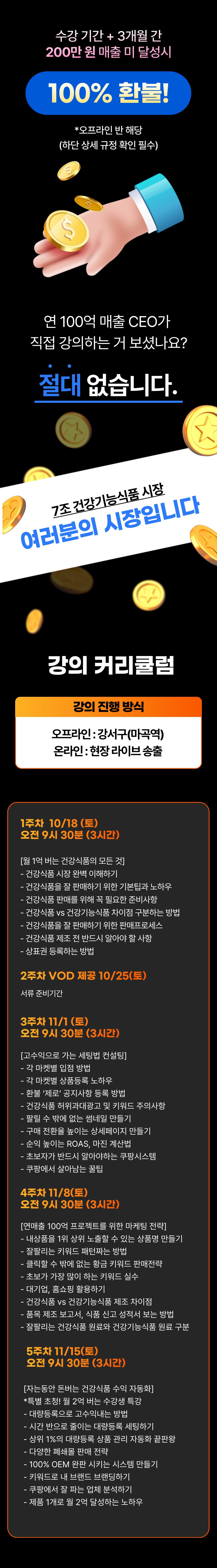 오프라인 밀착 케어반의 경우 수강 기간 종료일로부터 3개월 이내로 200만 원 매출을 달성하지 못하는 경우, 아래 조건에 해당되는 수강생 분들에 한해 100% 환불 신청이 가능합니다. (오프라인 밀착 케어반만 해당)