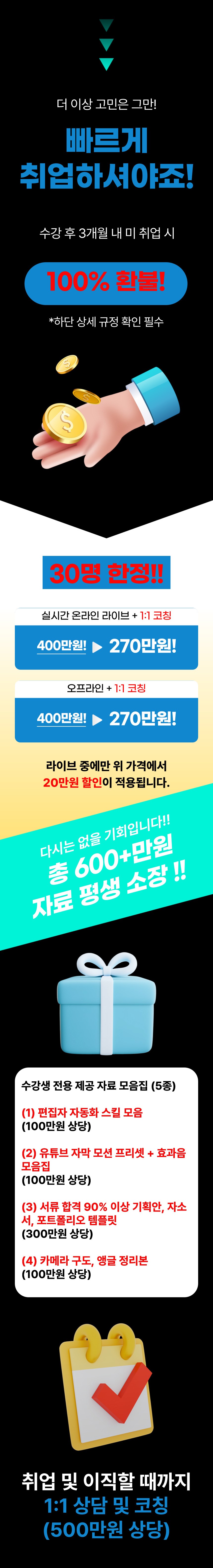 *수강기간 내 정규 강의 (8회) 100% 참석 필수 (지각, 결석 불가), 주차별 과제를 기한 내 100% 정상 제출 한 자에 한해 적용됩니다. (녹화본 수강 후 기한 내 과제를 100% 제출한 자는 인정합니다.)