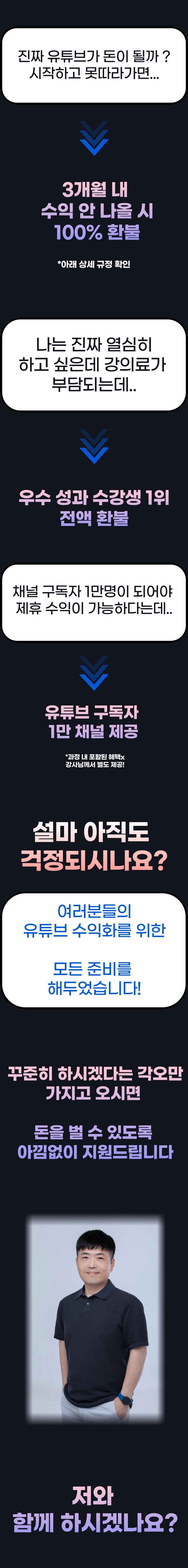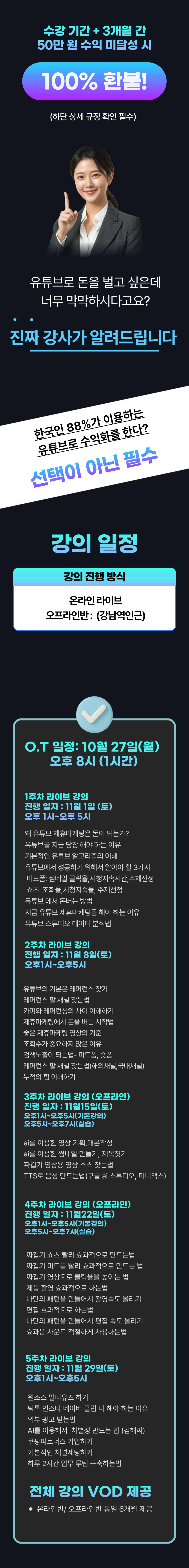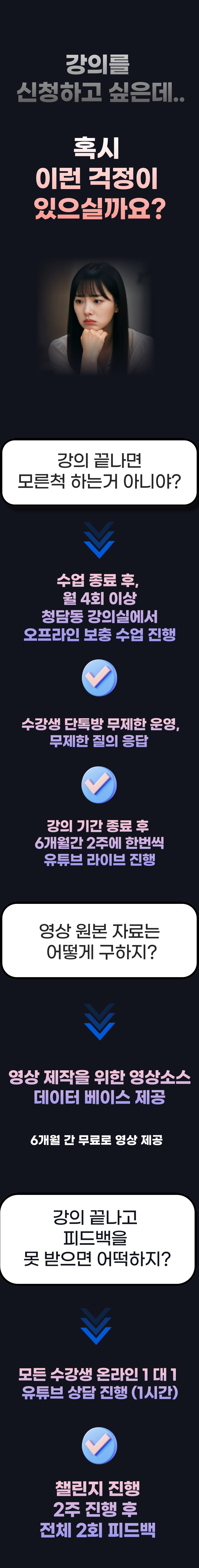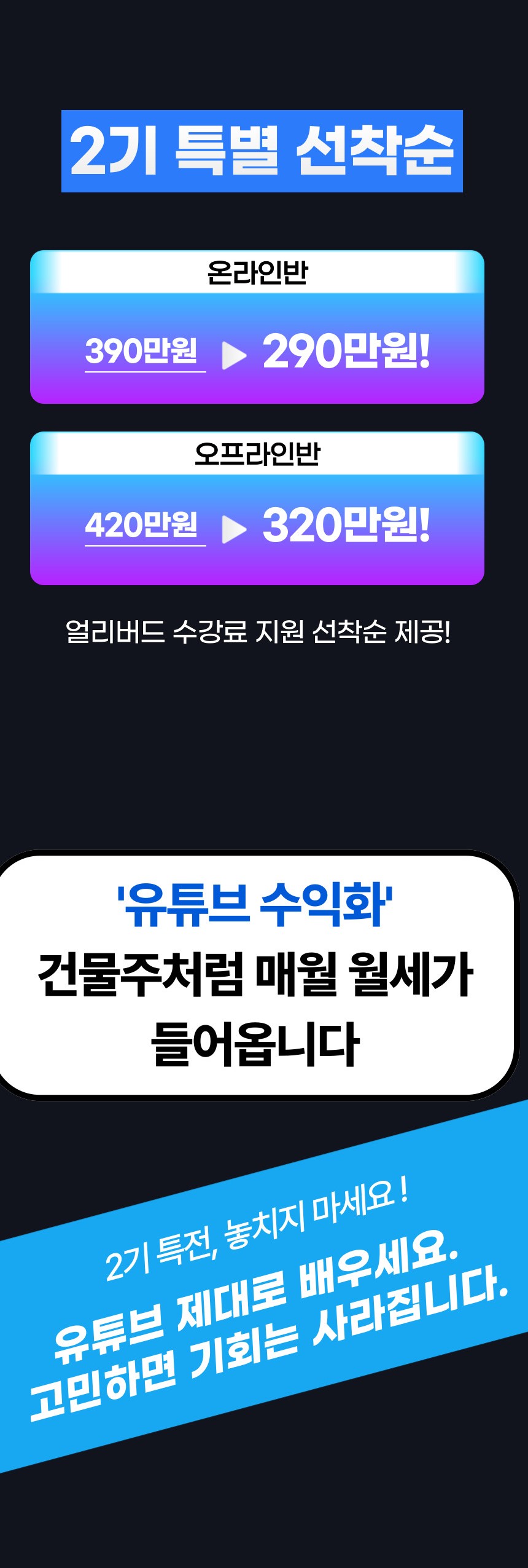 이번 과정을 신청하신 온라인, 오프라인반 수강생에게 제공되는 유튜브 구독자 1만 채널 무료 제공은 정규 커리큘럼과는 별도로, 강사님이 자율적으로 제공하는 추가 혜택입니다. 해당 채널은 공식 교육 과정에 포함되지 않습니다.
