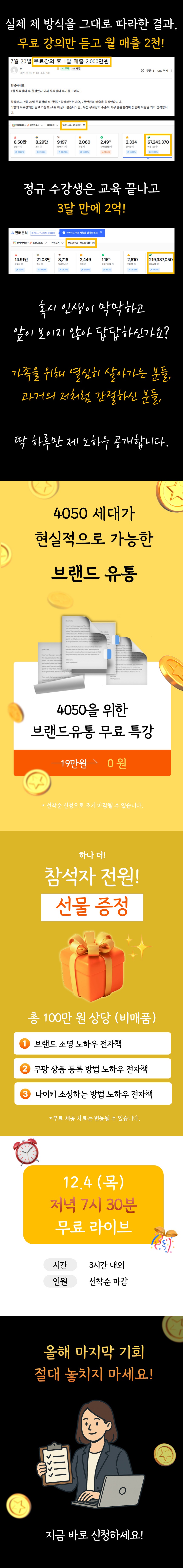 55살에 시작한 브랜드 유통으로 월 매출 3억 낸 노하우!무료 누적 신청자 수 : 5 명 55살에 시작한 브랜드 유통으로 월 매출 3억 낸 노하우! 수량 바로신청 카테고리: 무료강의 2025-12-04 19:30:00 바로신청