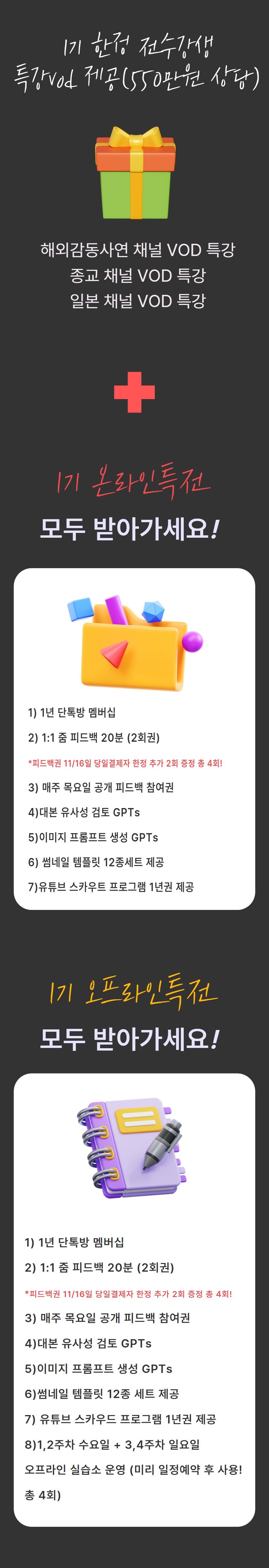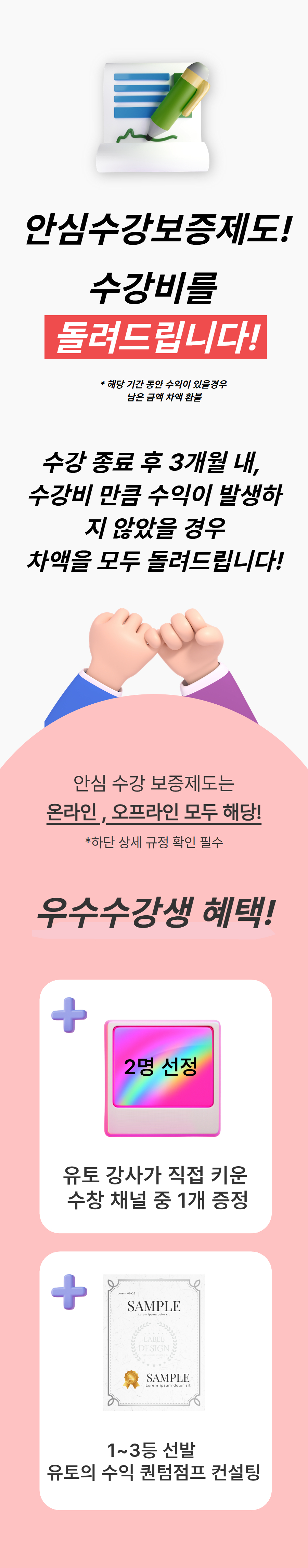 옵션 1) 수강생분들에 한해 수강비 차액 100% 환불 (*총 강의비에서 종료후 3개월 수익금을 제외한 나머지 금액만 환불됩니다.)