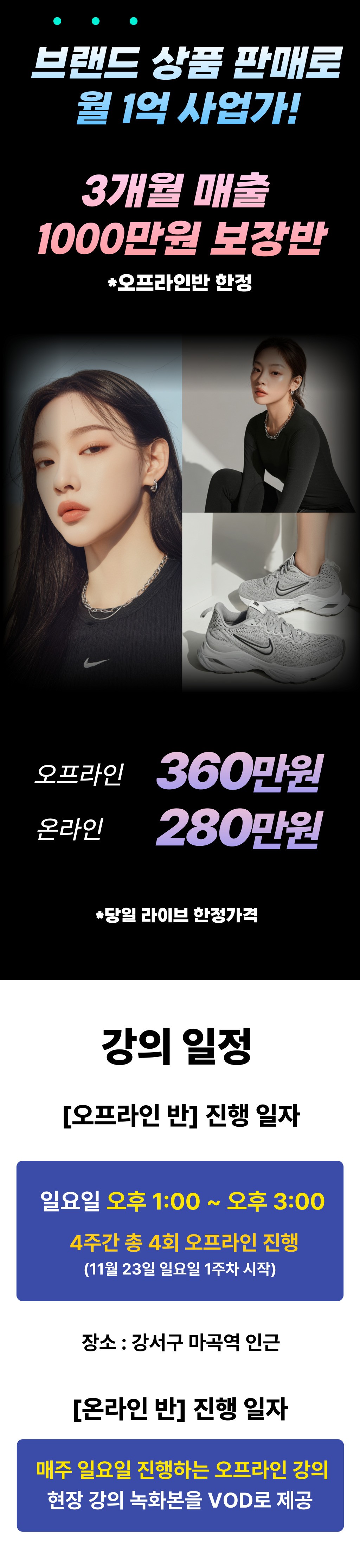 수강 종료 후 3개월 내 1000만원 매출이 나오지 않았을 경우 100% 환불 신청이 가능합니다.