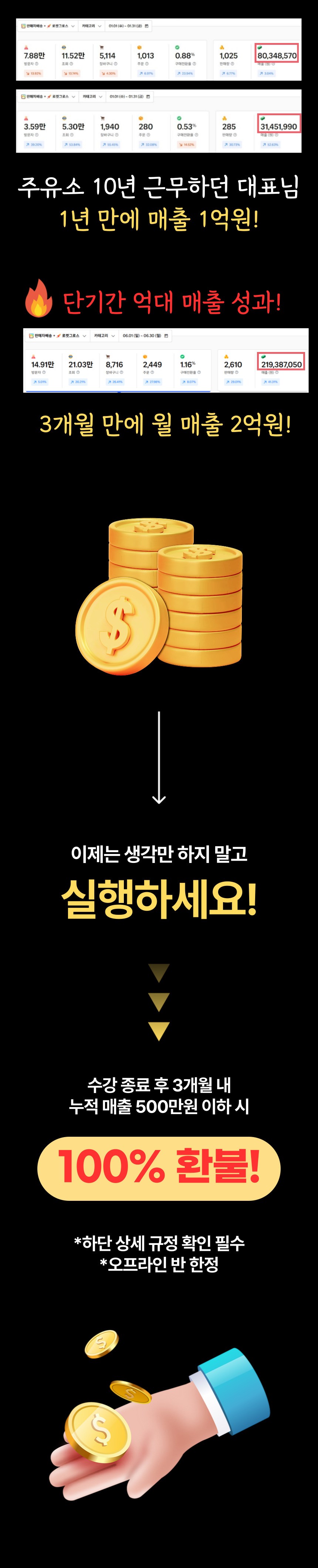 * 수강 종료 후 3개월 간 (마지막 강의 종료일로부터 그 주차 마지막 과제제출일을 기산일로 한다) 누적 매출 500만원 이하 시 수강비 100% 환불