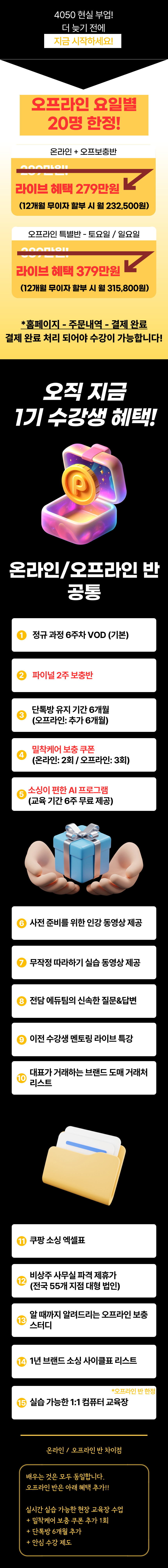 오프라인 및 온라인 수업 참석은 본인에 한해 가능하며 동행 및 타인 공유 시 그 즉시 수강 종료 처리되며 환불 불가합니다.