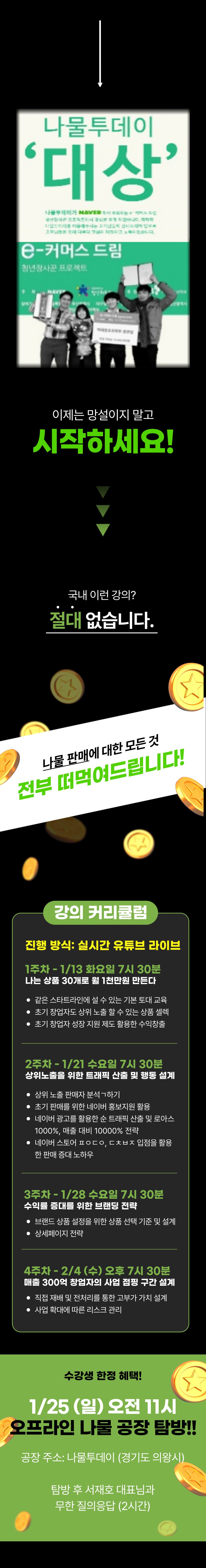 * 해당 기수에 오프라인 공장 견학 참여가 불가할 경우, 수강생 전용 톡방에서 강사님과 조율 후 다음 번 일정에 참여가 가능합니다.