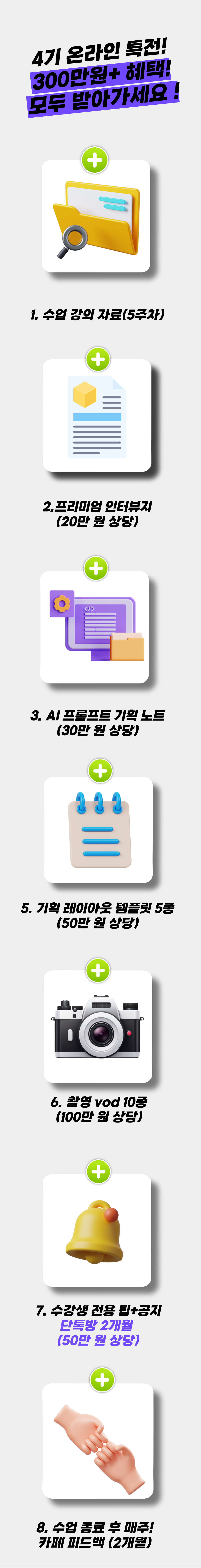 수강 혜택으로 명시 된 자료, 템플릿, 이용권한, VOD 시청권 등을 제공받은 후에는 진도와 무관하게 환불 불가합니다.