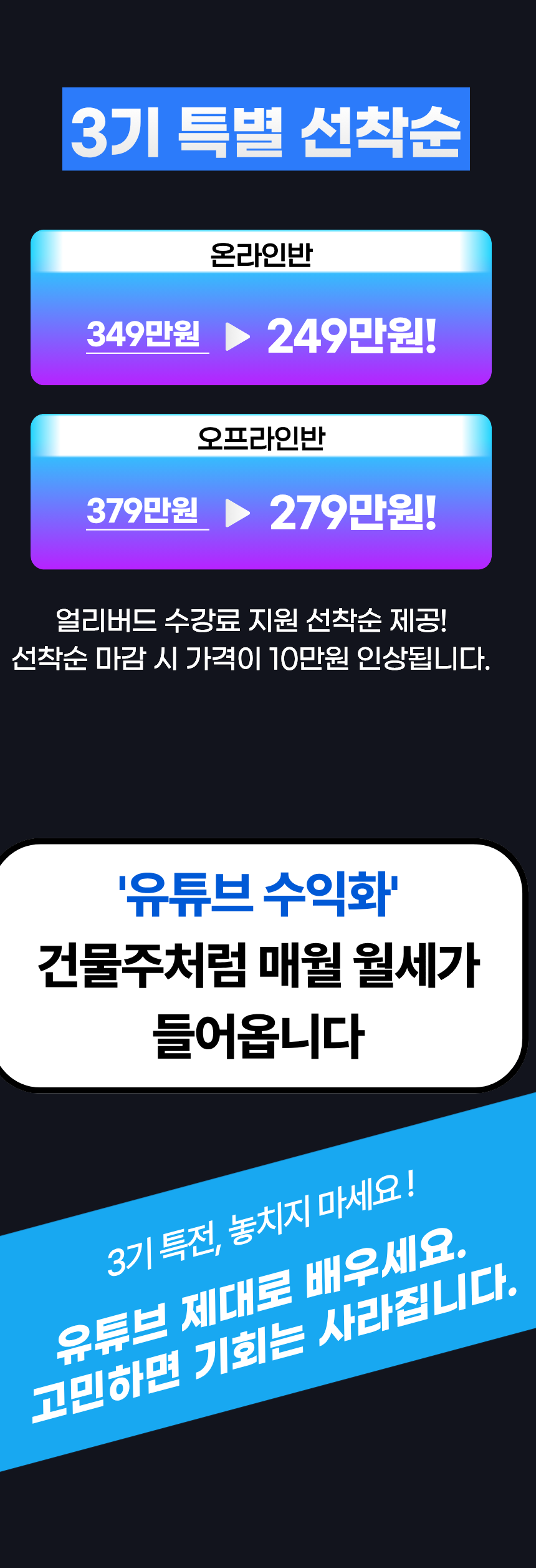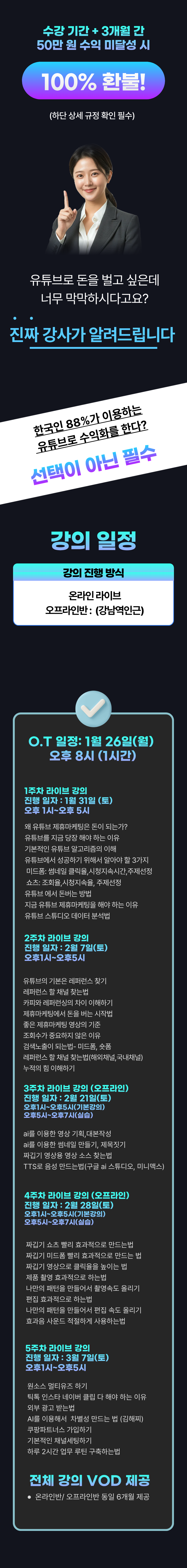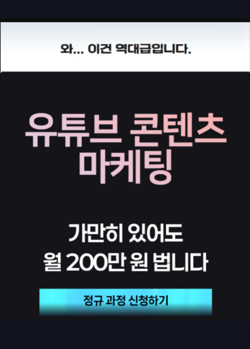 이번 과정을 신청하신 온라인, 오프라인반 수강생에게 제공되는 유튜브 구독자 1만 채널 무료 제공은 정규 커리큘럼과는 별도로, 강사님이 자율적으로 제공하는 추가 혜택입니다. 해당 채널은 공식 교육 과정에 포함되지 않습니다.