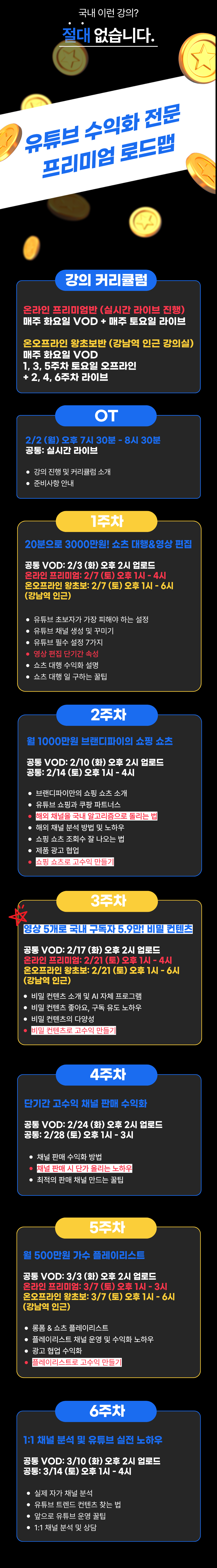 1. 온라인 프리미엄 반 : 본 과정은 O.T (1회) + 온라인 라이브 (6주) + 온라인 VOD (6회) 형태로 총 6주간 진행됩니다.