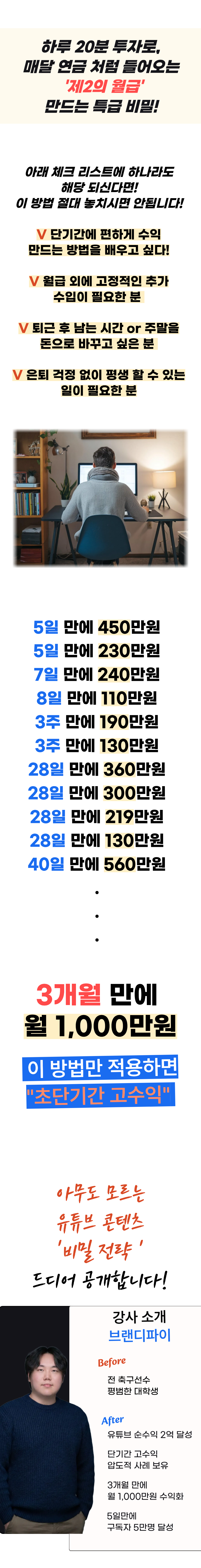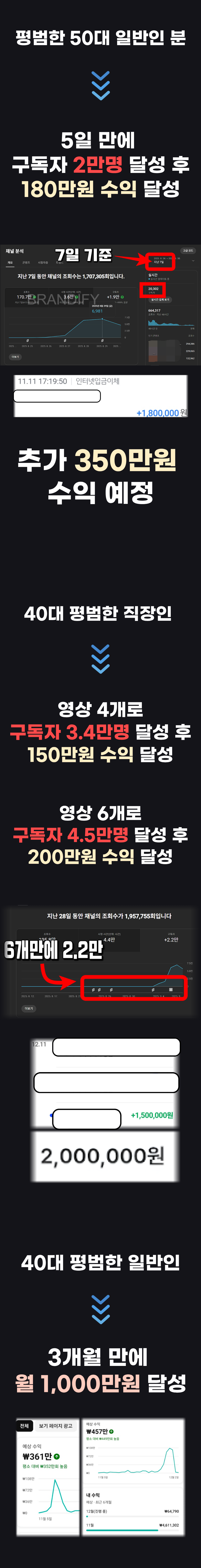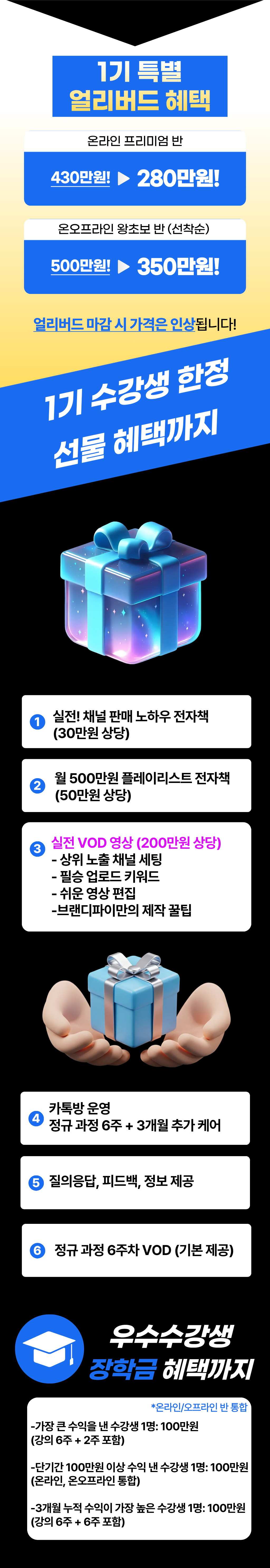 - 본 보증제도에서 말하는 “수익”이란, 보증기간 동안 수강생이 본 과정 관련 활동으로 발생시킨 모든 경제적 이익을 의미하며, 명칭·형태를 불문합니다(예: 광고수익, 협찬/제휴, 상품/서비스 판매, 외주/용역, 채널 판매대금, 현금성 혜택 등).