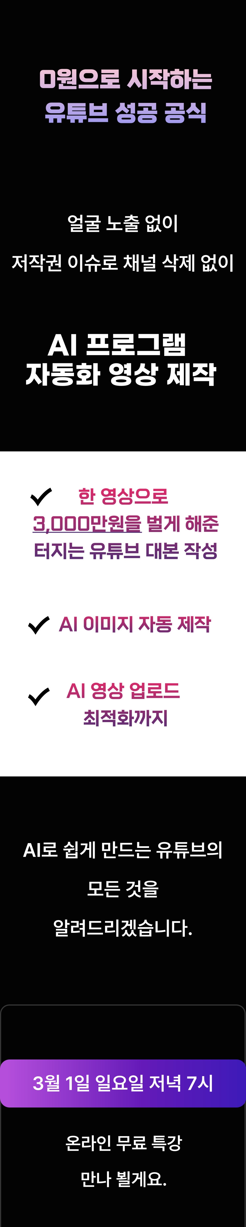 AI 유튜브로 6개월만에 8,000 만원 버는 로드맵!무료 누적 신청자 수 : 1 명 AI 유튜브로 6개월만에 8,000 만원 버는 로드맵! 수량 바로신청 카테고리: 무료강의 2026-03-01 19:00:00 바로신청