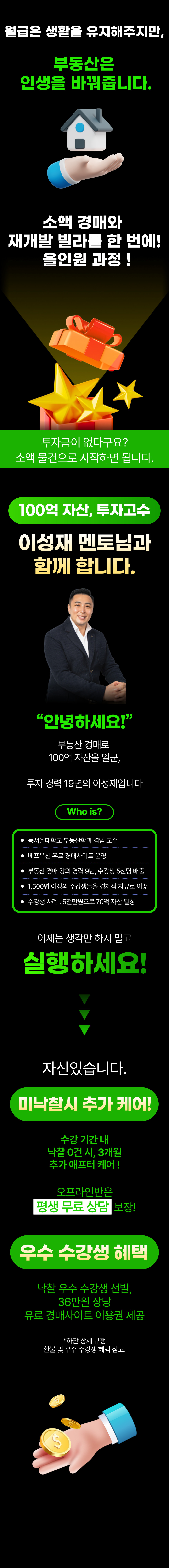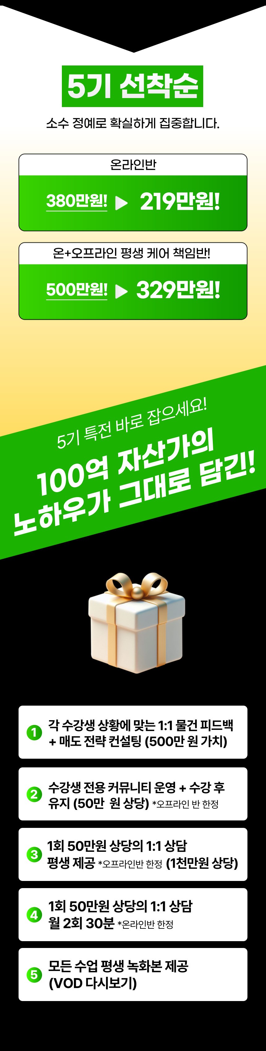 모든 주차의 과제를 성실히 수행하고, 수강 기간 내에 가장 빠르게 낙찰을 받으신 분 1명을 선정하여 36만원 상당의 ‘베프옥션’ 유료 경매 사이트 1년 이용권을 전달해 드립니다.