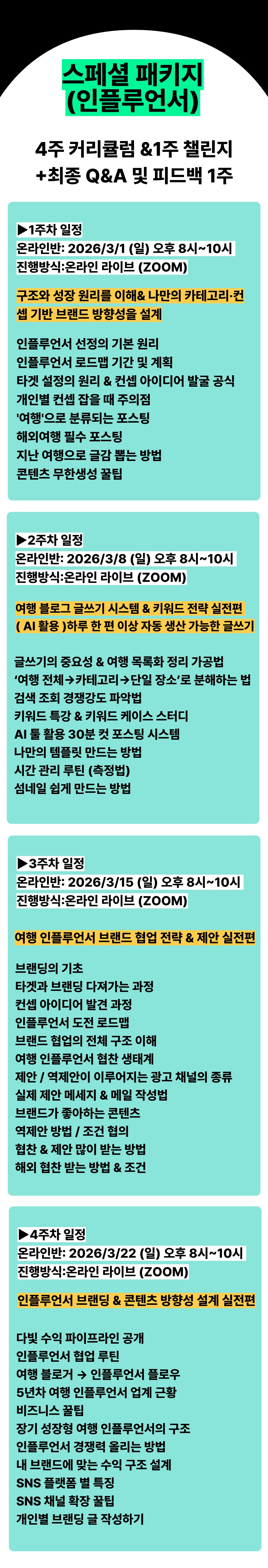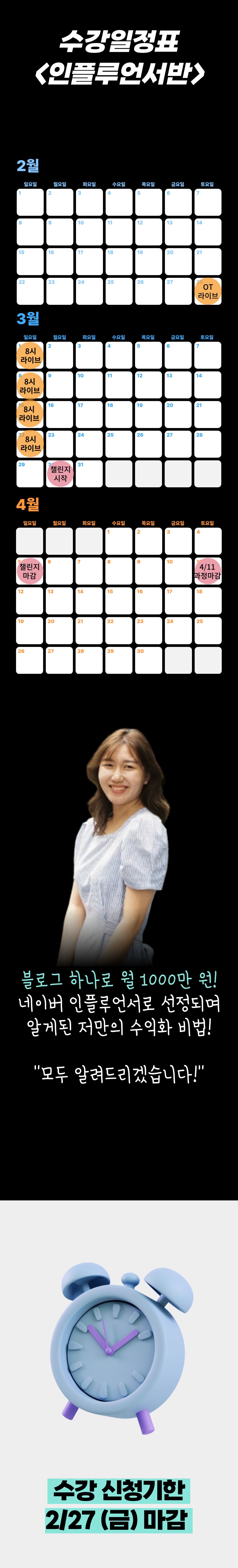 - 강의 형태 및 수강 기간 : 본 강의는 O.T 1회 (OT 하루전 수강생 전용 카톡방 공지로 제공) + 온라인 VOD + 라이브 형태로 총 4주 진행됩니다. (인플루언서반은 추가 1주 챌린지+1주 추가 코칭이 진행됩니다)